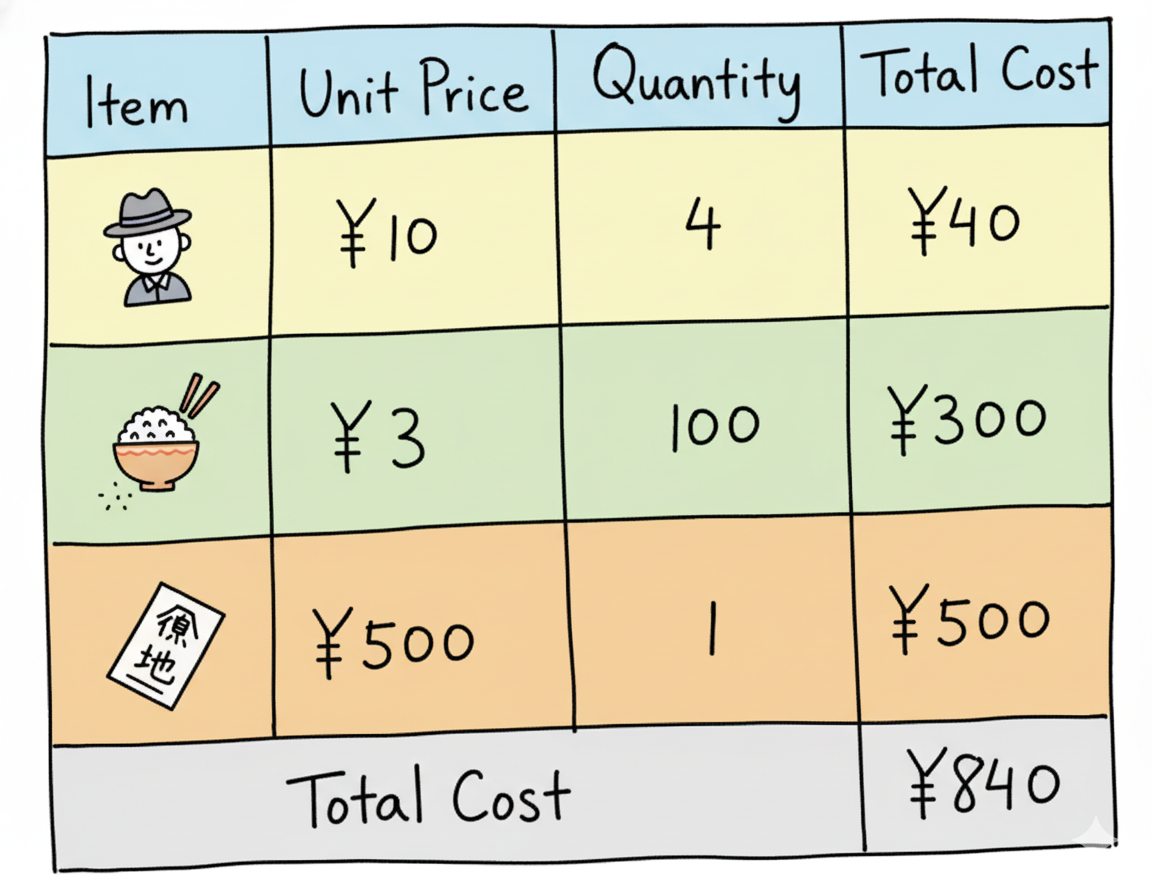 现在来看总成本。咱们的成本包括几个部分:人工、饲料、土地,还有其他费用。咱们把它列成一个表: