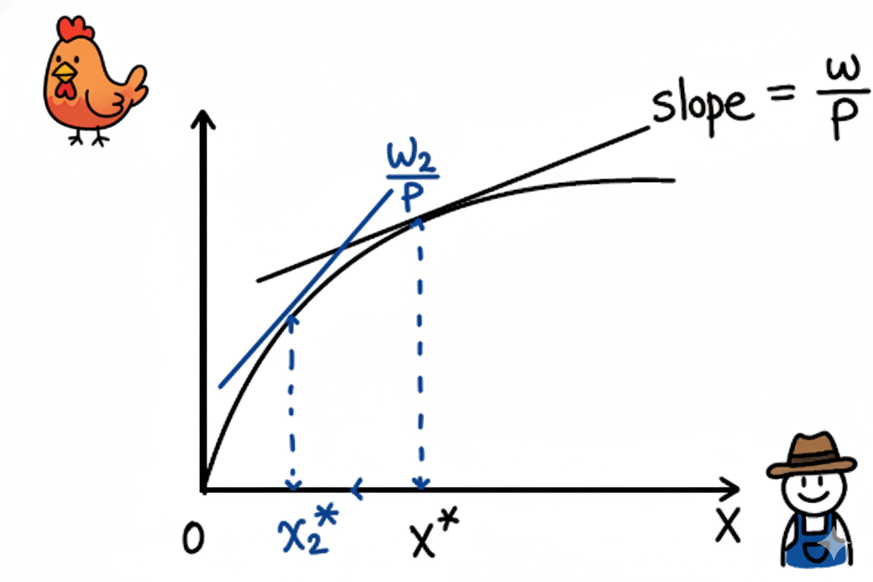然后,我们再画一条直线,它的斜率是 \(w_1 / p\)(饲养员的工资除以鸡的价格)。这条线代表成本和收入的平衡。要找到最优的饲养员数量,就让这条直线变成切线,正好切于生产函数曲线上。切点的位置,就是那个黄金法则满足的点——边际产品价值正好等于工资的最优饲养员数量 \(x_1^*\)。